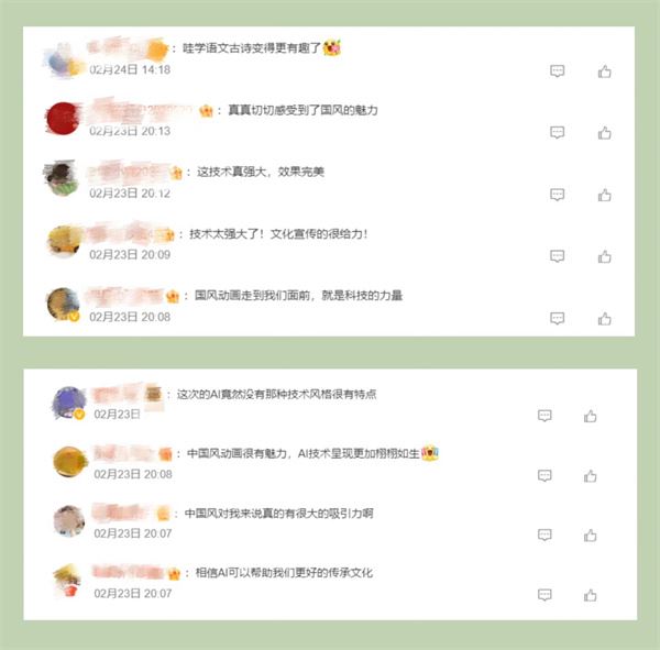 节目探索诗画融通的国风动画片新呈现,让广大青少年进一步加深了对中国经典诗词的理解和喜爱。“AI”“总台”“千秋诗颂”等成为网友热议高频词。截至2月27日20:00,话题#千秋诗颂#阅读量超791万次。网友纷纷留言:“看到这个系列片,我真的深深感受到了中国传统文化的深厚底蕴。这些古诗词深入骨髓,流淌在我们的血液中,是我们国家的文化符号”“以AI为媒,央视制作的这部国风动画片传承了经典,唤醒了古韵的新生命”“唯美的画面让人动容,用视觉的形式了解《别董大》这一首古老的诗歌更别有一番韵味”“这种科技与动画片的结合,恰好是现在小朋友们和大朋友们所需要的”。