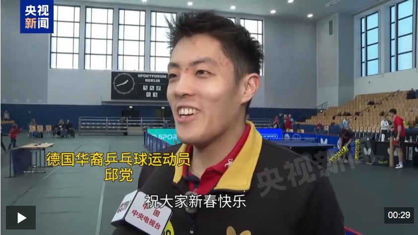 现效力于杜塞尔多夫俱乐部的华裔乒乓球运动员邱党在接受总台记者采访时表示,春节是全世界华人最重要的节日,春晚是每年有数亿观众收看的节目。他说,由于常年奔波各地参赛,春节期间并不总能与家人团聚,但他期待今年能看到春晚,也会提醒朋友们观看。