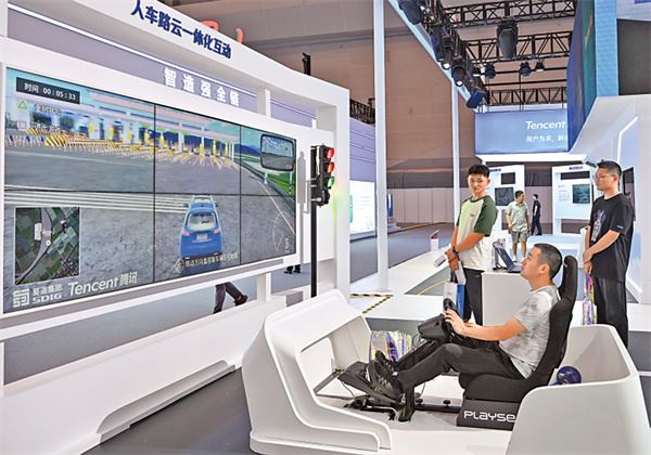 觀眾在深圳舉辦的2023智博會騰訊展廳體驗人車路雲一體化互動。新華社