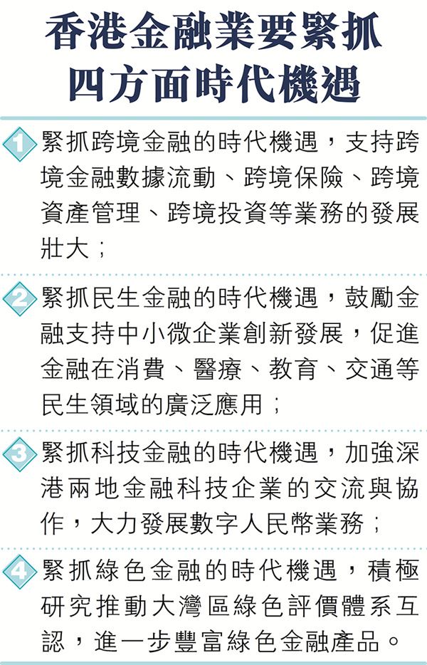 總括而言,駱咪認為,香港要緊抓四方面的時代機遇:1)緊抓跨境金融方面的時代機遇,支持跨境金融數據流動、跨境保險、跨境資產管理、跨境投資等業務的發展壯大;2)緊抓民生金融方面的時代機遇,鼓勵金融支持中小微企業創新發展,促進金融在消費、醫療、教育、交通等民生領域的廣泛應用;3)緊抓科技金融方面的時代機遇,加強深港兩地金融科技企業的交流與協作,大力發展數字人民幣業務;4)緊抓綠色金融方面的時代機遇,積極研究推動大灣區綠色評價體系互認,進一步豐富綠色金融產品。