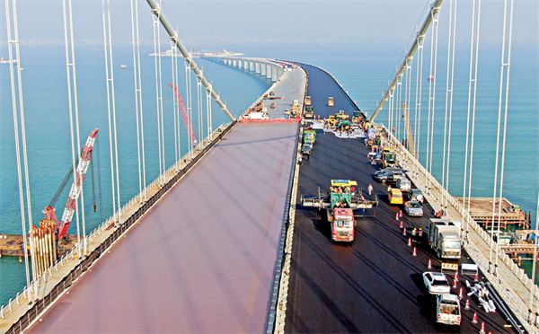 去年11月27日,工人在深中通道伶仃洋大橋進行路面鋪裝工作。(新華社)