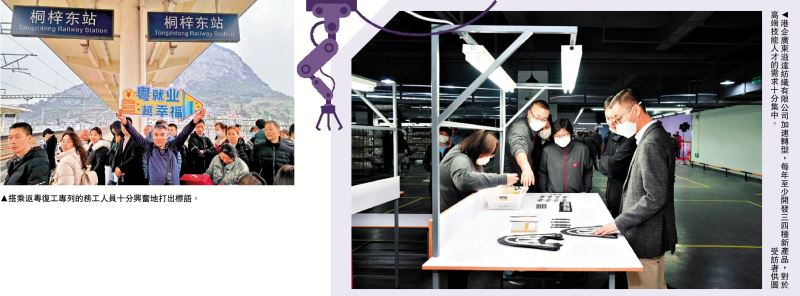 (大公報 記者 盧靜怡)紅火的春聯,滿地的鞭炮紅屑,港商喜氣洋洋地派開工利是,迎接新一年訂單,衝刺「開門紅」。春節後,珠三角大小港企都迎來熱鬧「開工季」。據統計,2023年外地在粵務工人員約2400萬,預計春節後至元宵節有九成以上務工人員返粵復工。隨着粵港澳大灣區港企逐漸向自動化、智能化轉型升級,以及重視原創性,增強綜合實力和競爭力。今年招工出現新趨勢。除了車間流水線的普工,懂得簡單編程的技術工、可以運營電商的網絡推手等高端技能型人才,開始成為港企不惜以高工資、好福利來競逐的對象。此外,珠三角港企還與職業學校共同培育技術學徒,滿足用工需求。