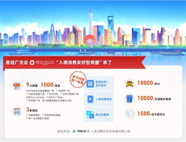 从4月11日起,广州9大核心商圈超过1000家商户、3家涉外酒店,18000辆出租车以及地铁、公交等主要交通出行线路,一起加入了由蚂蚁集团发起的“入境消费友好型商圈共建计划”,通过亮码、亮标向更多的入境宾客广而告之:来广州,手机扫,付得畅,行得通。