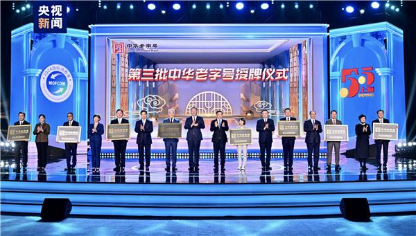 2024国际消费季暨第五届上海“五五购物节”启动仪式现场,王文涛、慎海雄、盛秋平、华源、司马红、李文海、张国智、谭萍为32家企业颁发商务部第三批中华老字号称号。