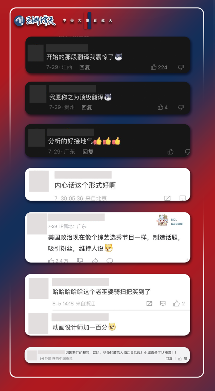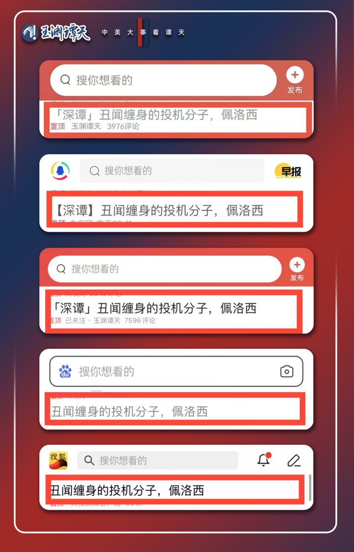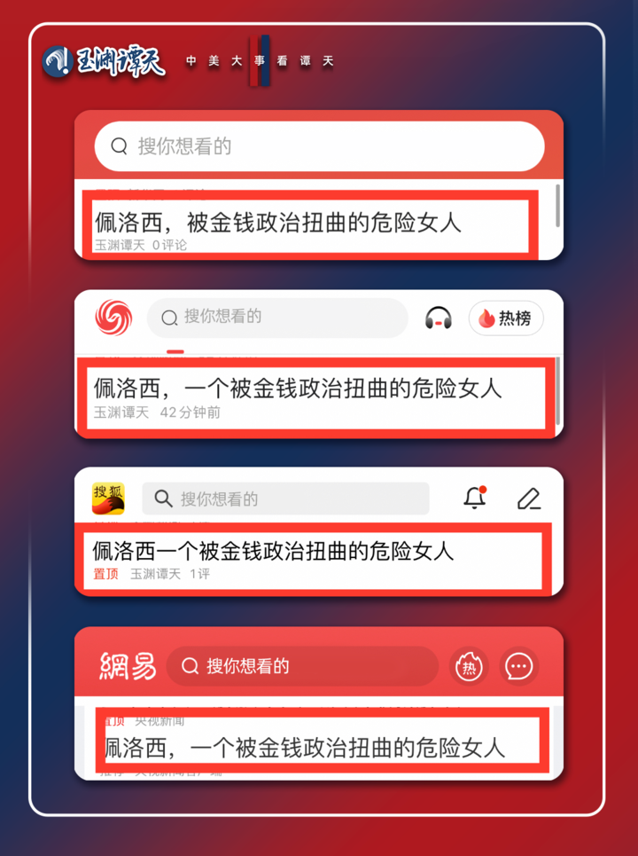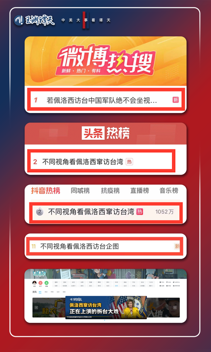 【深谭】报道全网总触达量近5亿次,报道设置的“丑闻缠身的投机分子”这一标签深入人心,多家国内外主流媒体以此为角度进行再创作。“投机分子”等词,成为知乎、今日头条、抖音、百度等平台用户,在佩洛西相关报道下的评论热词。