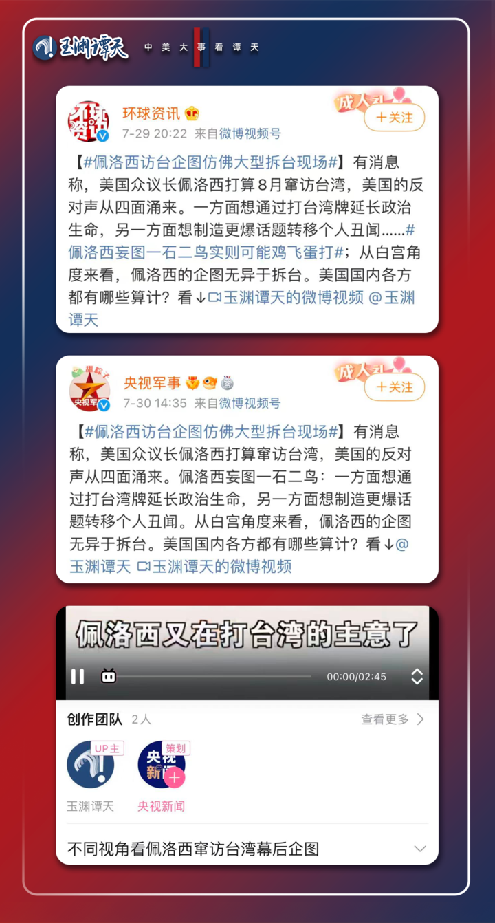 兵无常势,水无常形。在创作过程中,玉渊谭天整理分析了上百家海外主要媒体对此事的报道,收集了上万条来自境内外社交媒体平台的网友评价,不断感受舆论场复杂情绪的微妙变化,不断调整报道的心态、时态、语态。在佩洛西窜台消息曝光之时推出,先发制人。