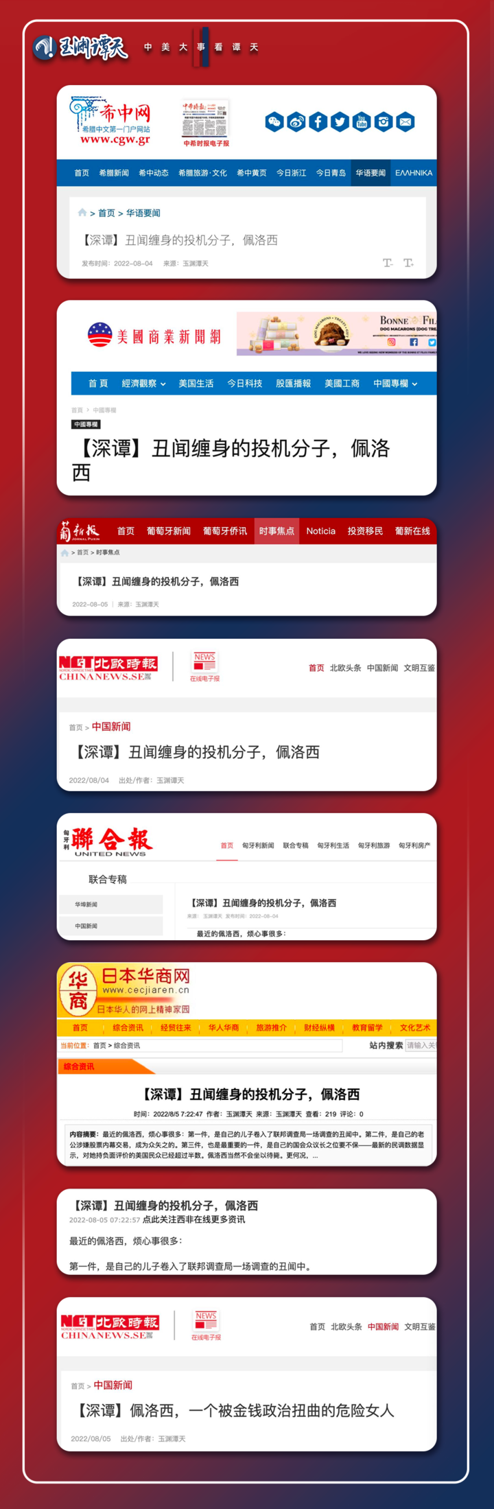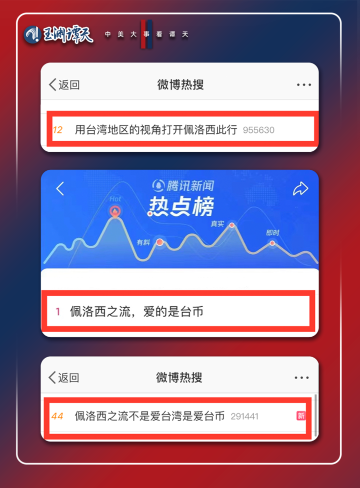 8月3日,玉渊谭天微信公众号首发报道《【深谭】丑闻缠身的投机分子,佩洛西》,阅读量迅速突破10万加,全网置顶。以故事化的叙述和历史纵深的视角,揭露最近“烦心事很多”的佩洛西,靠打“台湾牌”为自己谋取政治地位的动机。