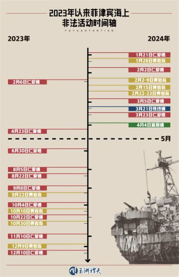 这是2023年以来,菲律宾在南海挑衅滋事的时间线,可以看到,在防务准则更新后,菲律宾在南海挑衅滋事的频次骤增。