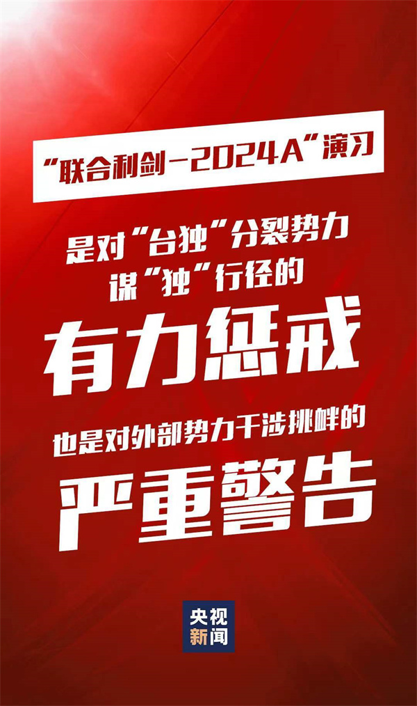 5月23日至24日,中国人民解放军东部战区组织战区陆军、海军、空军、火箭军等兵力,位台岛周边开展“联合利剑-2024A”演习,重点演练联合海空战备警巡、联合夺取战场综合控制权、联合精打要害目标等科目,舰机抵近台岛周边战巡,岛链内外一体联动,检验战区部队联合作战实战能力。这是中国维护国家主权和领土完整的正义之举,也是对“台独”分裂势力谋“独”行径的有力惩戒,对外部势力干涉挑衅的严重警告。