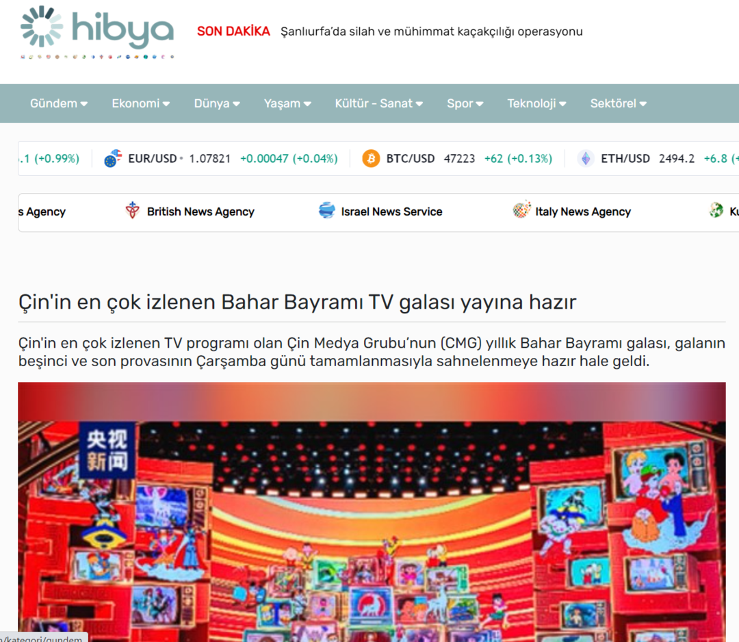 此外,阿联酋国家通讯社、土耳其希比亚通讯社、叙利亚复兴报、阿尔及利亚丝路新闻网等多家媒体官方网站对总台龙年春晚以及相关新春活动都做了报道。其中土耳其希比亚通讯社在该通讯社官方网站开设“总台春晚专栏”,十余篇报道递进追踪春晚动态。报道指出,今年的春晚融合了尖端技术,实现沉浸式舞台互动,是春节期间的必看节目。