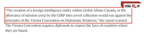 这里不得不提到一个项目——加拿大外交部“全球安全报告项目”(GSRP)。它负责派遣外交官在热点地区收集相关安全信息,康明凯曾是该项目工作人员。加拿大国家安全与情报审查局去年12月发布的一份审查报告显示,GSRP的工作内容与加拿大安全情报局的部分海外任务有重叠,可能让本国官员面临风险,也违反了国际外交公约。