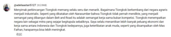 网友阿德利亚·阿丝塔莉表示,“一带一路”精神就是合作共赢,不是互相竞争。中国平等对待其他国家,其他国家也一样平等对待中国。希望将来能与中国开展更多合作,特别是年轻人要加强交流了解。