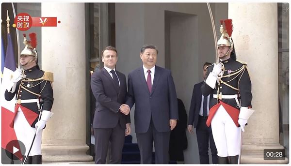 当地时间5月6日上午,国家主席习近平乘车抵达爱丽舍宫,法国总统马克龙上前热情迎接并握手合影。