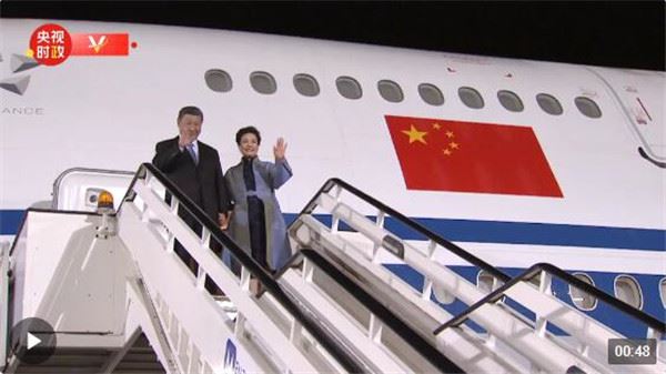 △独家视频丨习近平夫妇步出舱门 法国总统马克龙夫妇在机场热情迎接