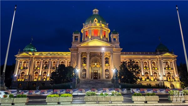 △塞尔维亚国会大厦亮起红灯,欢迎习主席到访。(总台央视记者石丞拍摄)