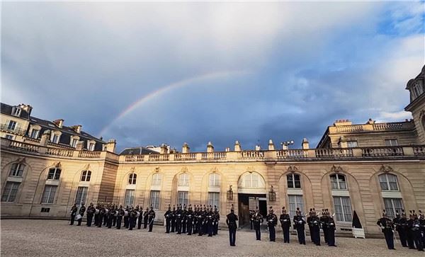 当地时间5月6日晚,习近平主席在巴黎出席马克龙总统举行的盛大欢迎宴会。宴会前,爱丽舍宫上空出现彩虹。彩虹连接着东西方。塞纳河畔,正写下中法两国“双向奔赴”的新故事。
