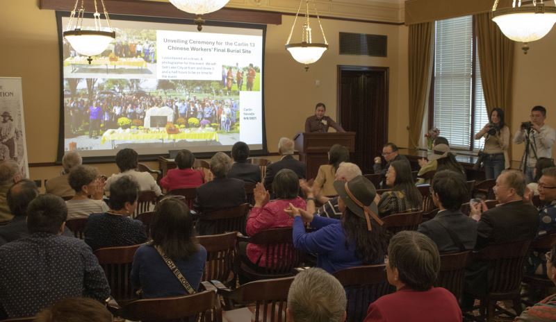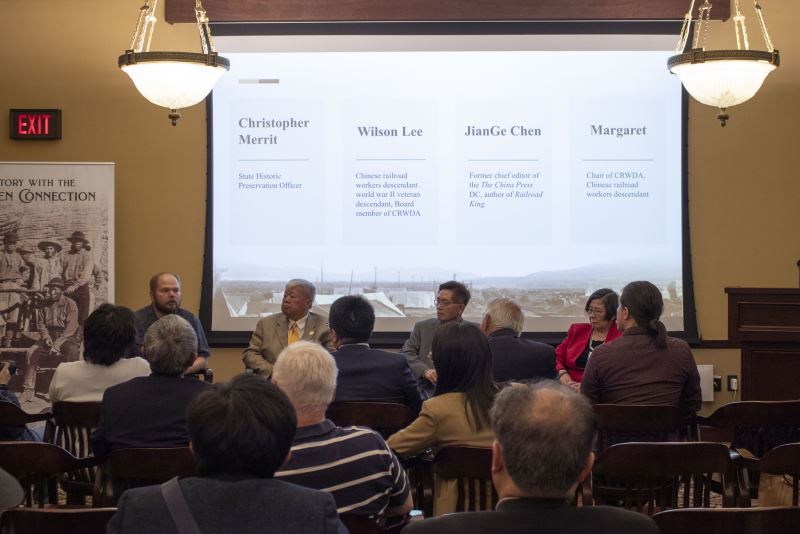 “华工成就了太平洋铁路,太平洋铁路成就了美国,铁路华工值得被铭记。”美国当地时间5月11日晚,在美国犹他州议会大厦举办的一场“金钉情缘(My story with Golden Connection)”故事分享会上,犹他州“铁路华工后裔协会”会长余黄铿娟动情地说。