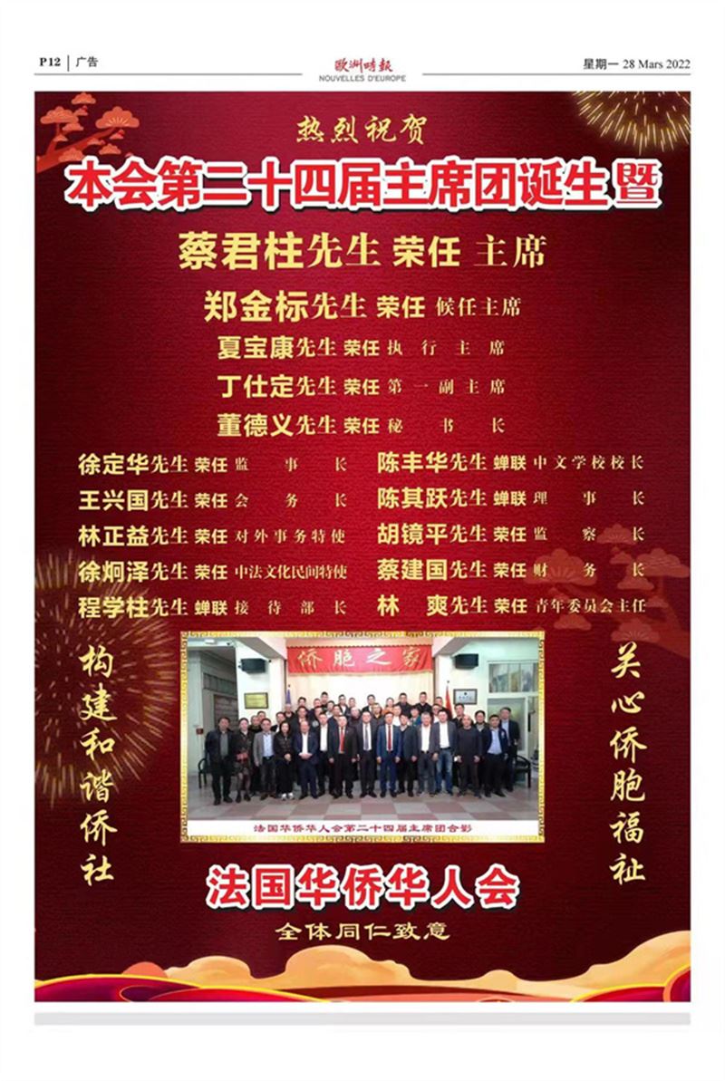 近日,法国华侨华人会新主席团在热烈和谐的气氛中诞生,蔡君柱先生当选我会第二十四届主席,郑金标先生当选第二十四届候任主席、第二十五届主席。他们两位都是法国华侨华人会的优秀骨干之一,多年来,他们不仅乐于奉献、热衷侨团事务,而且具有组织才能,并享有较高的威信,今天两位主席实至名归,我为他们感到高兴!