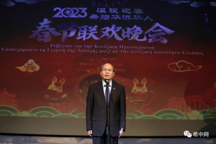 中国驻希腊大使肖军正在晚会上发表新春致辞,他表示,在过去的一年里,中希两国在各个领域的合作都取得了重要的成就。关山初度尘未洗,策马扬鞭再奋蹄。未来,中希关系将迎来更好的发展,中希两国人民的友谊也将更加友好和紧密,他代表中国驻希腊使馆衷心地祝愿祖国繁荣昌盛,全世界各族人民新春快乐、所得皆所愿。随后,肖大使向各侨团代表发放春节礼包,与旅希侨胞共庆新春的到来。