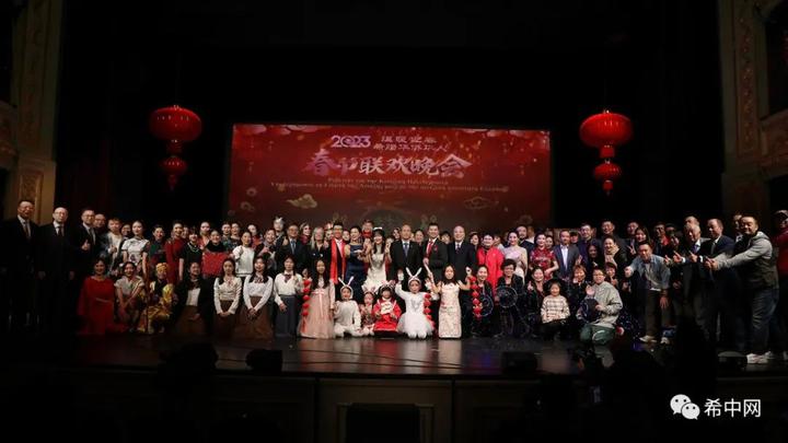 晚会的最后,在矫婕双排键弹奏的春节序曲旋律中,肖大使和侨团代表们纷纷上台和演职人员们合影留念,感谢他们的辛勤付出为大家带来如此精彩绝伦的文艺演出,并祝福各位新春快乐、兔年吉祥。