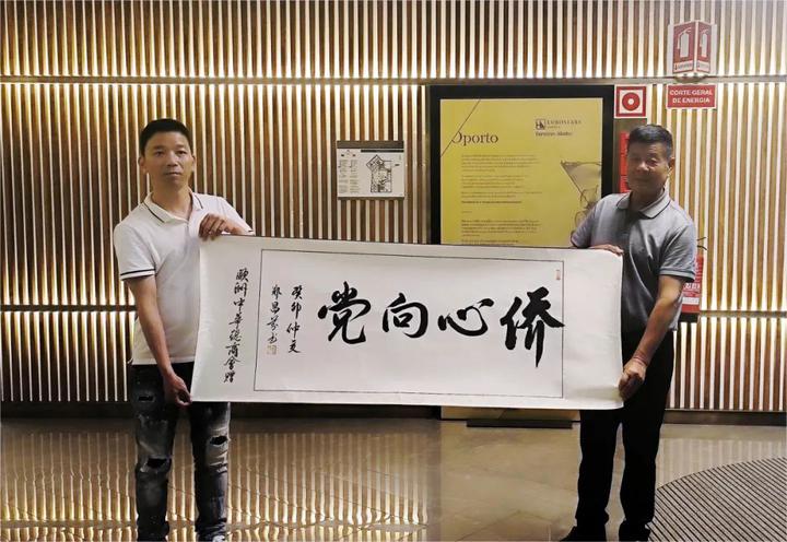 在与葡萄牙北部侨团座谈时,陈贻成强调了“侨心向党”这一中心思想,希望通过走访进一步加强欧洲各侨团之间联系交往,让散落在欧洲各国的华人侨团能形成一股凝聚力,为祖(籍)国的发展,为讲好中国故事,传播中国声音贡献力量。图为陈贻成向葡萄牙瑞安同乡会会长潘贻敏赠送礼品(书法作品《侨心向党》)。