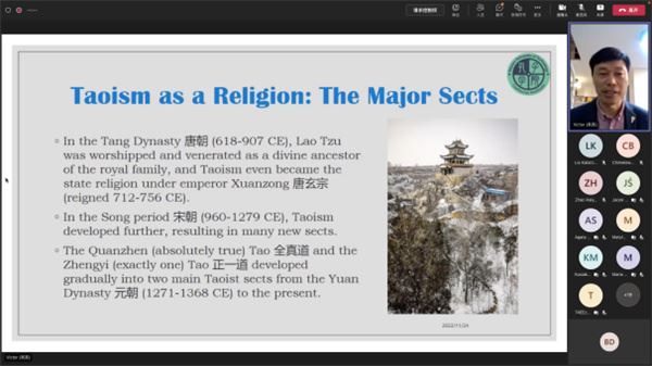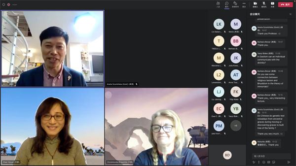 欧中之声讯(记者 杜小凤 通讯员 董必曦 )2022年11月26日,华沙理工大学孔子学院成功举办“中国文化解码”系列讲座之“中国道教里的‘生’、‘死’透视”在线讲座。本次讲座特别邀请了李树春博士主讲,华理孔院外方院长博古米娃·赫梅莱夫斯卡(Bogumiła Chmielewska)、中方院长赵海燕以及30余名孔院师生、波兰的中国文化研究学者及都柏林“爱尔兰-中国文化协会”会员参加讲座。