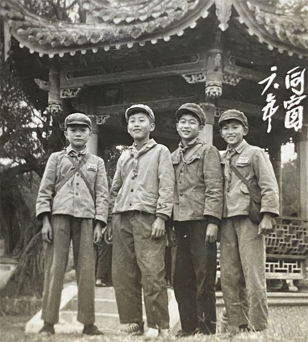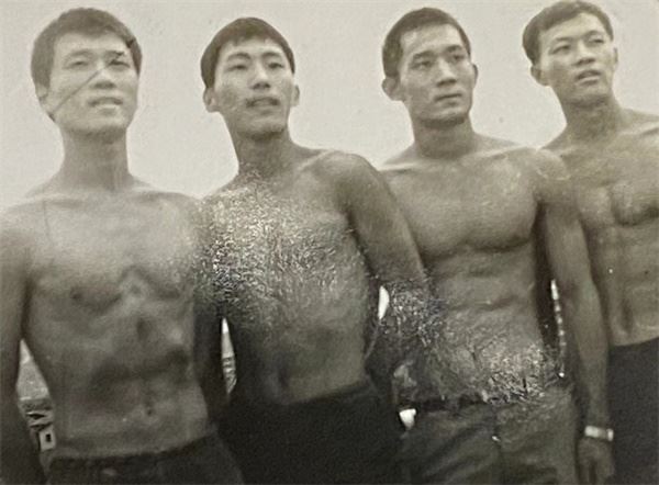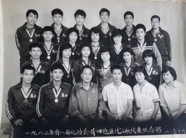 1976年,黄勇与少小游泳队队友陈晓丹、黄勇、陈晓峰、黄金腾一起合影。