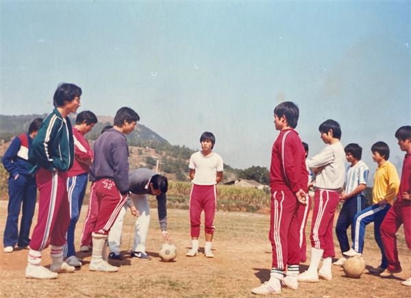 1985年5月,黄勇在福清分校足球场,在给84级足球专修班同学教学讲解。