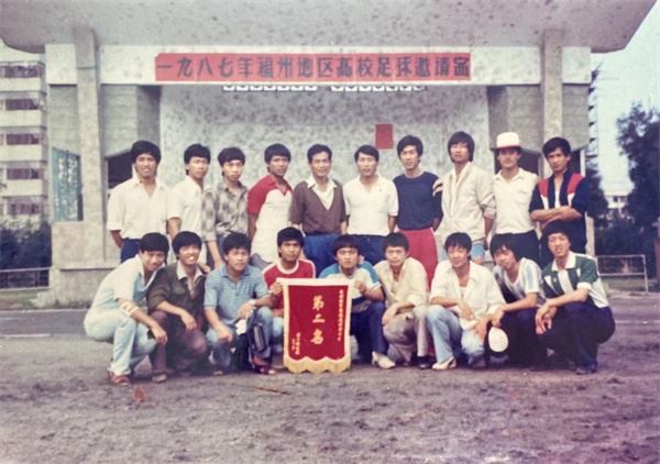 黄勇带队参加1987年福州地区高校足球邀请赛,荣获亚军载誉归来,与校党委书记陈政及相关领导及系负责人合影留念。