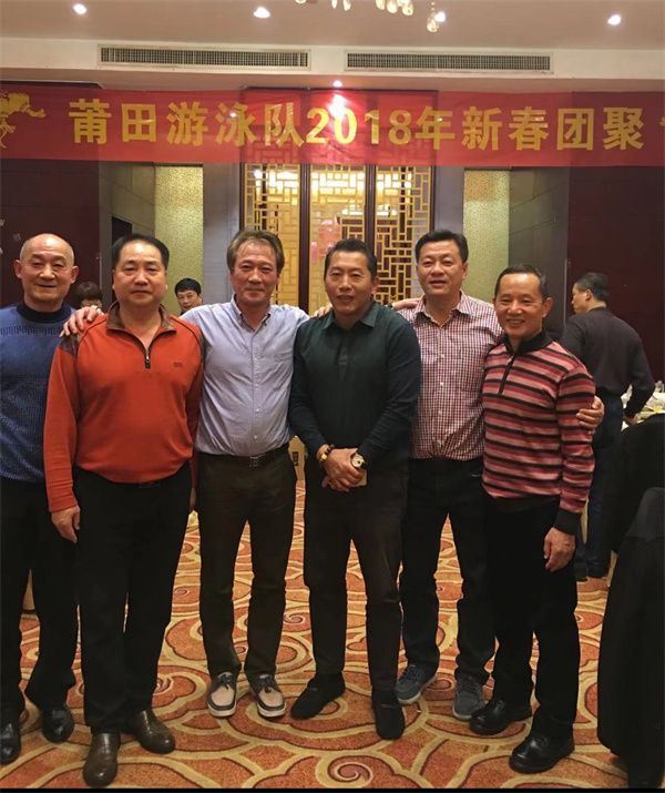 2018年新春团拜,莆田游泳队六位同龄队友合影(左至右:陈晓峰、林兵、陈晓丹、黄勇、黄金腾、林志平)。