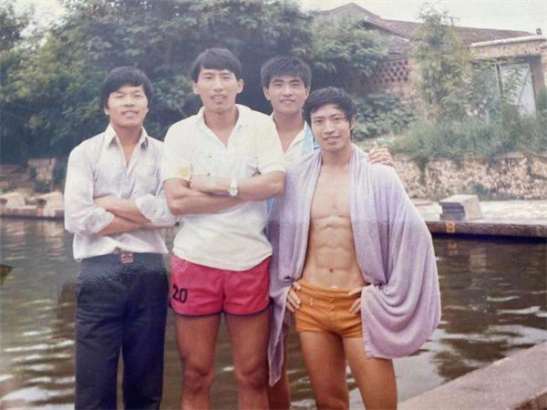 1984年,在福建师范大学福清分校游泳教学课中,与学生一起合影。左起,郑晓乐(现为福建厦门中峻地产有限公司董事长)、黄勇、黄伟强(现为厦门大同中学高级教师)、林明(现为福州八中高级教师)。