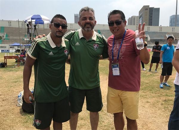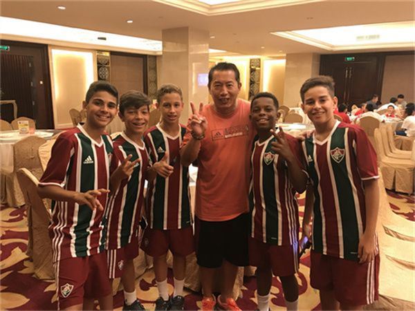参加2017年金砖五国少年足球邀请赛期间,黄勇与巴西少年部分足球运动员合影。