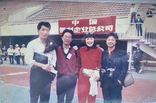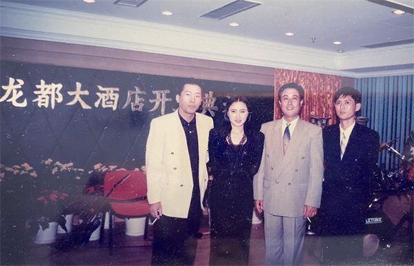 1995年龙都大洒店开业,黄勇等主持开业系列仪式。左起:黄勇、梦雪、弘力、朱宾副总。