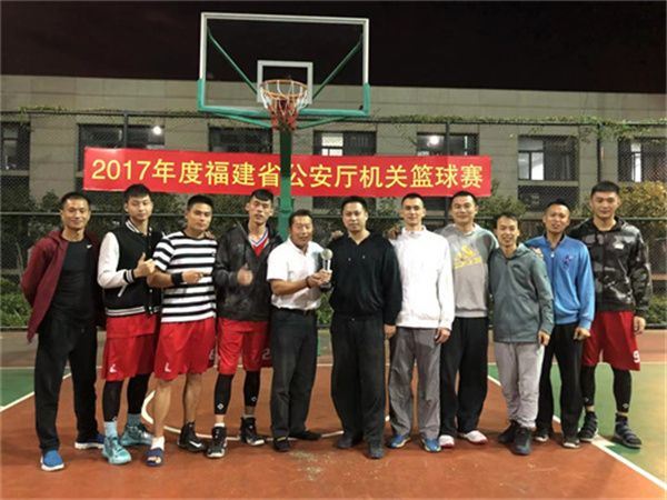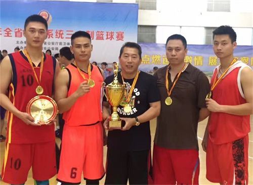 黄勇带领福建省消防总队蓝球队参加省公安厅机关蓝球比赛,夺得冠军后与队员合影。