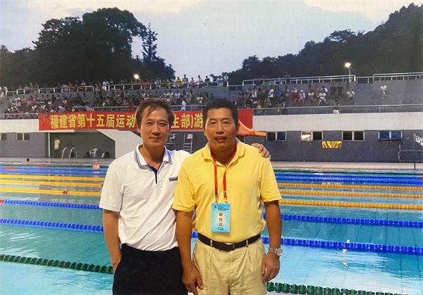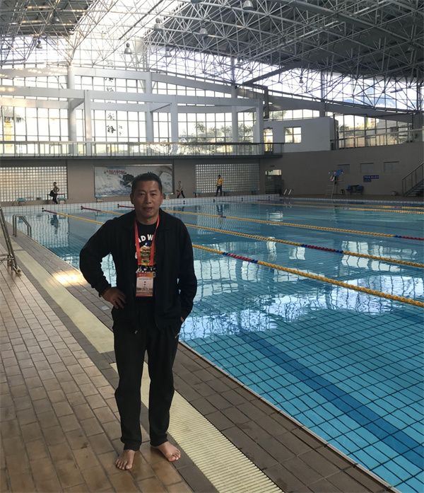 2017年,黄勇担任福建华侨大学游泳高水平运动员招生面试的专家组成员工作。工作空闲时在泳池留影。