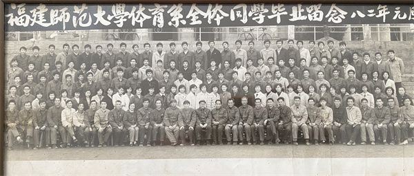 1982年2月,福建师范大学体育系77级全体师生毕业典礼合影。