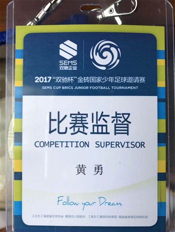 黄勇受国家体育局邀请担任2017年金砖五国少年足球邀请赛的比赛监督。