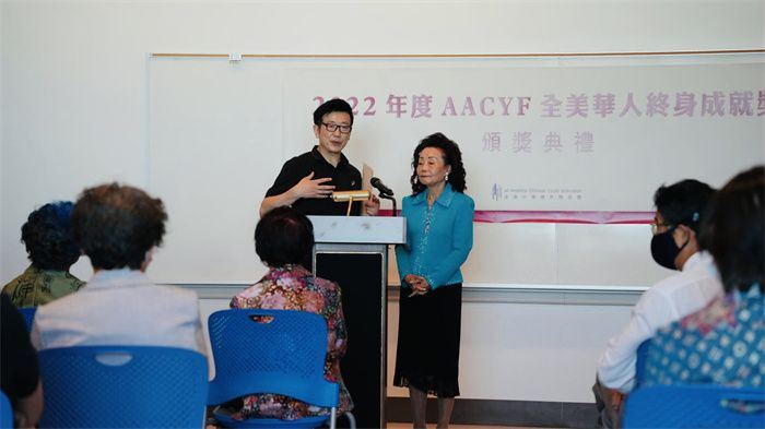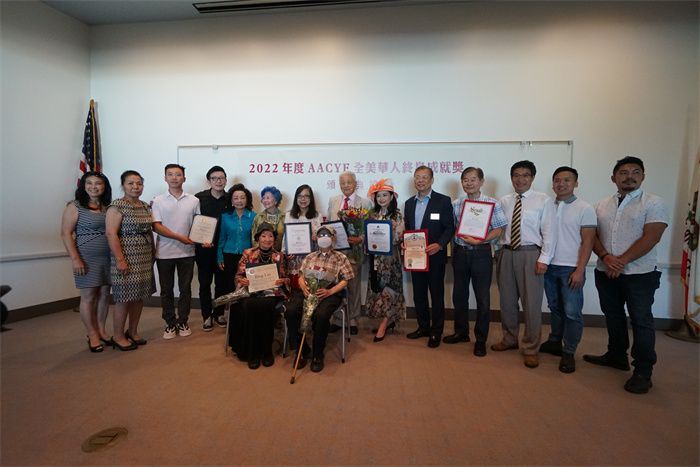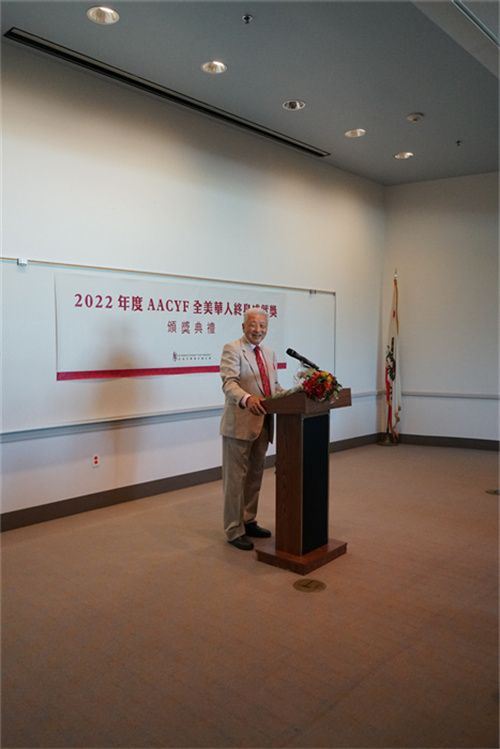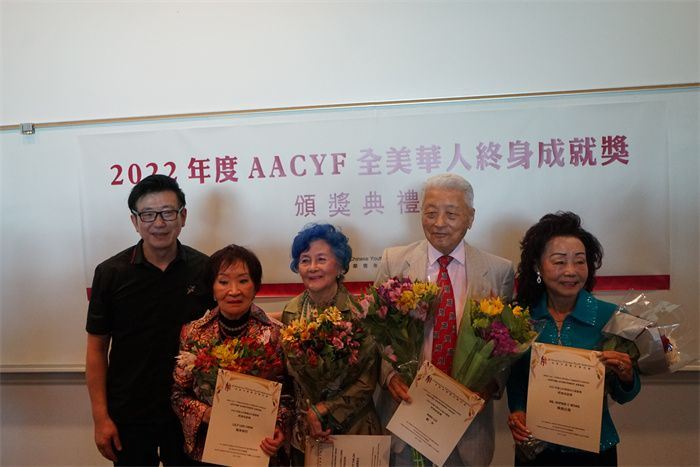 全美中华青年联合会的会长任向东(左一)与获奖嘉宾合影