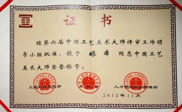 2012年11月被授予第六届中国工艺美术大师。