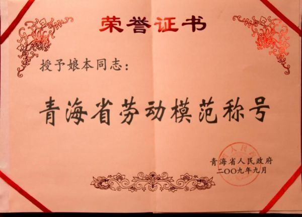 2009年9月,鉴于娘本近年来为热贡艺术、社会公益慈善事业及带动青海省经济发展等方面作出的突出贡献,荣获“青海省劳动模范”称号。