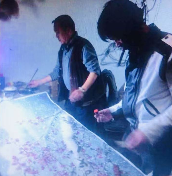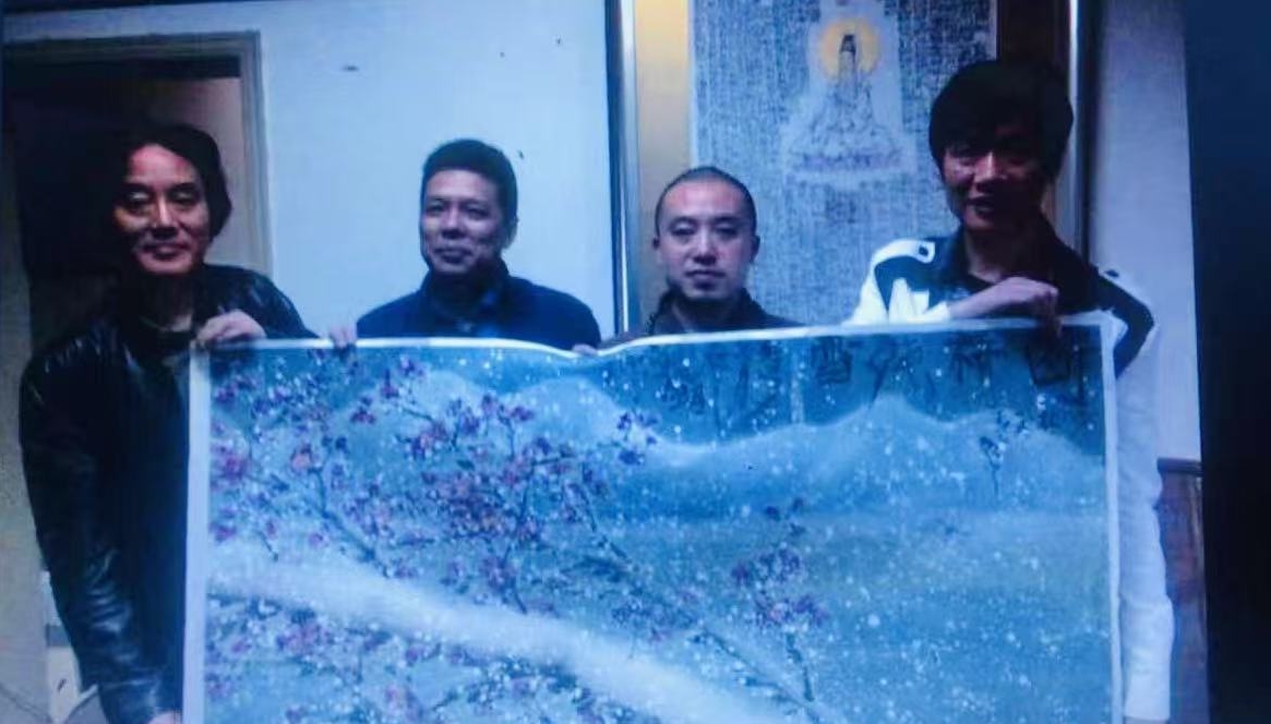 那日,中国美院副院长王赞、少林寺武僧团团长释延达法师、田园教授等诸君,皆会聚一堂。众人立于画前合影,彭教授立于一侧,青衫磊落,神采飞扬,眉宇间自有一股清气。照片至今犹存,然照片中人,已有作古者,令人唏嘘。彭教授作画,最擅写意。一笔下去,山不是山,水不是水,却又分明是山水精神。他常言:“画者,心迹也。”观其《断桥残雪》,桥横水面,雪点江天,寥寥数笔,已得江南冬韵之神髓。桥虽断而气脉不断,雪虽残而意韵不残。此中三昧,非深于画道者不能解。