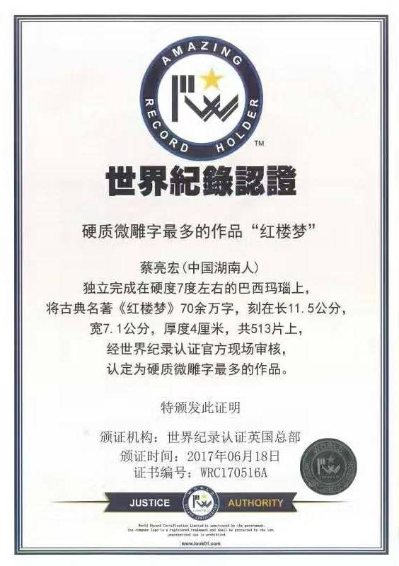 1990年,其多件篆刻、书法作品捐赠北京亚运会,获亚运组委会颁发的纪念奖及荣誉证书。1998年制作的《红楼梦》玛瑙微雕在北京展出,被国家有关部门收藏,并获得世界吉尼斯纪录。称为“硬质微雕世界第一人”。曾先后为党和国家领导人................莫言、前苏联总统叶利卿、台湾马英九、吴伯雄、等40多位部级以上领导人绘画或篆刻制印;为深圳仙湖揽胜亭、梧桐山风景区等刻石题匾。他的作品曾多次在省市级报刊发表,曾获国际篆刻比赛银杯奖。赴葡萄牙、台湾等地举办个人画展。2009年获得第五届西冷印社篆刻展三等奖,成就与业绩被收入《湖南紫荆花集》及《广东省名人艺术总篇》等书籍中。中央电视台、广东省电视台、深圳电视台、中央党报、中国文化报、湖南日报、澳大利亚报刊《亚洲时代》、《澳大利亚时报》等多家电视报纸曾做过专题报道,“蔡疯子”被20多个国家聘为文化艺术顾问。