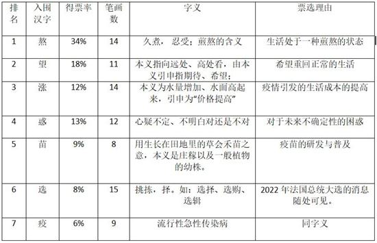 据了解,今年的征字活动筹备历时两个月(2021年10月至2021年11月),共收录了由法国网络用户提交的42个汉字,其中7个汉字由评委会筛选出,分别为(票数排名由高到低):