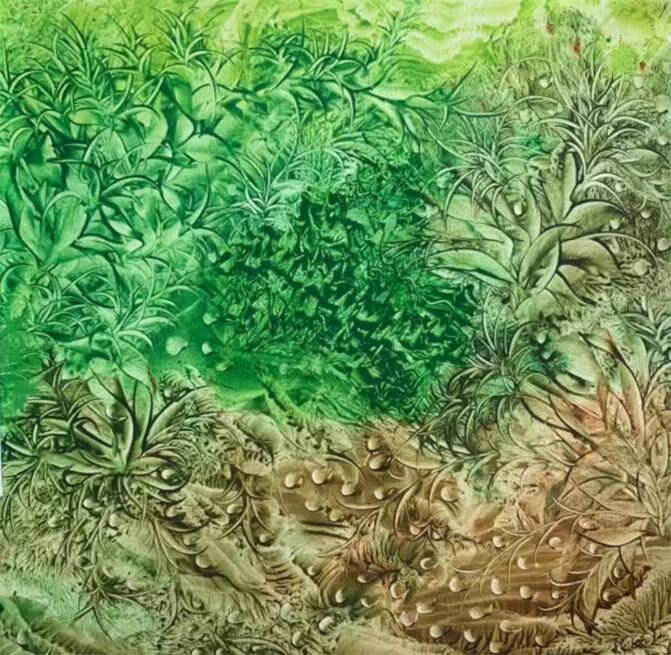 生命之花与自然之花的区别,就在于她是不受风霜雨雪而影响她的璀璨,而是因生活的磨砺而越发显现她的倔强和顽强。而这,恰恰在张媛的色彩斑斓的绘画作品里得到充分的展现,展现的那么朴实自然而又那么别样的用心。她的画,乍看你会觉得五彩斑斓,但一旦细细品味下去,你又会感觉到她笔下的色彩很单纯,每一幅画基本上都是以一个调子为主题;而在物象的处理上,或具象、或抽象,从而构成了在单纯的色彩里变化其或直或曲、或凸或显、或圆或方的复杂的结构关系,最为令人叫绝的是,她在理性、细腻的笔触即将完成之际,也就是较为静止的画面上,冷不丁的来一笔宛若随风飘动的虚幻般的彩带,使得画面不仅平添了一种打破平静的动感,而且还有一种令人神往的仙气。这种在同一个色调里表现丰富的结构关系和色彩魅力的手段,再一次显现了张媛对色彩的深刻理解和高超把控。