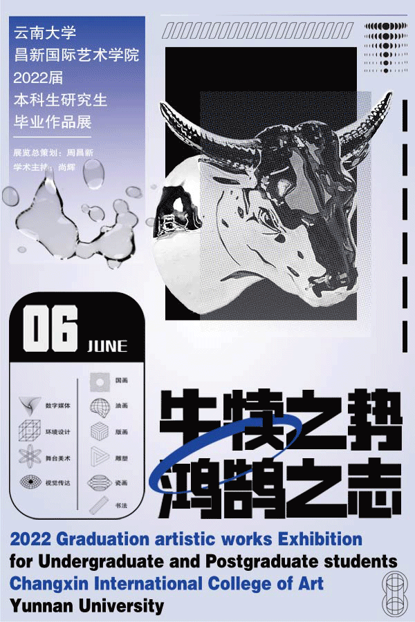中国文化人物(主编 王保胜) 云南大学昌新国际艺术学院成功举办2022届本科生、硕士生“牛犊之势·鸿鹄之志”毕业作品展,展览共分数字媒体、环境设计、舞台美术、视觉传达、国画、油画、版画、雕塑、瓷画、书法、作曲、音乐表演等十二个专业方向。
