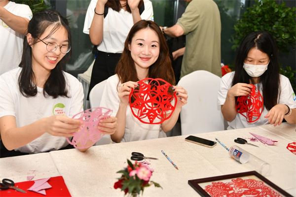 分享交流会上,粤港澳大湾区的师生学习剪纸和体验汉服。梁琪佳摄