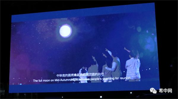 演出现场,还播放了中秋节庆的视频短片,主持人邀请现场观众一同品尝月饼,并与希腊和海外友人们共度中国的传统佳节。