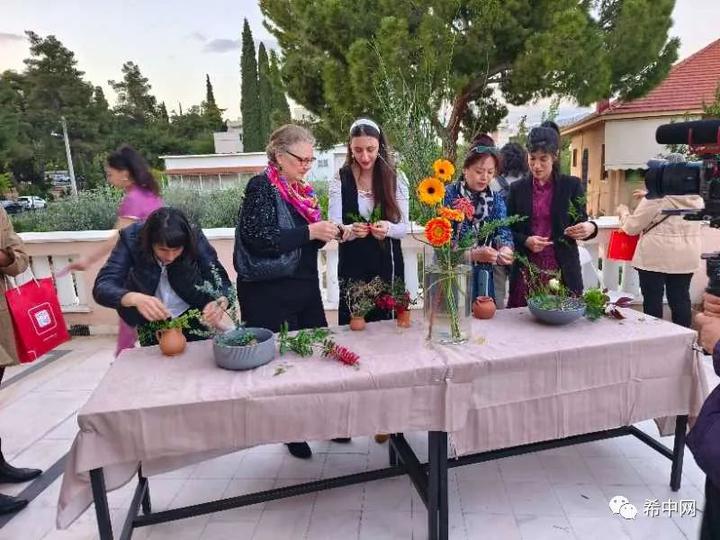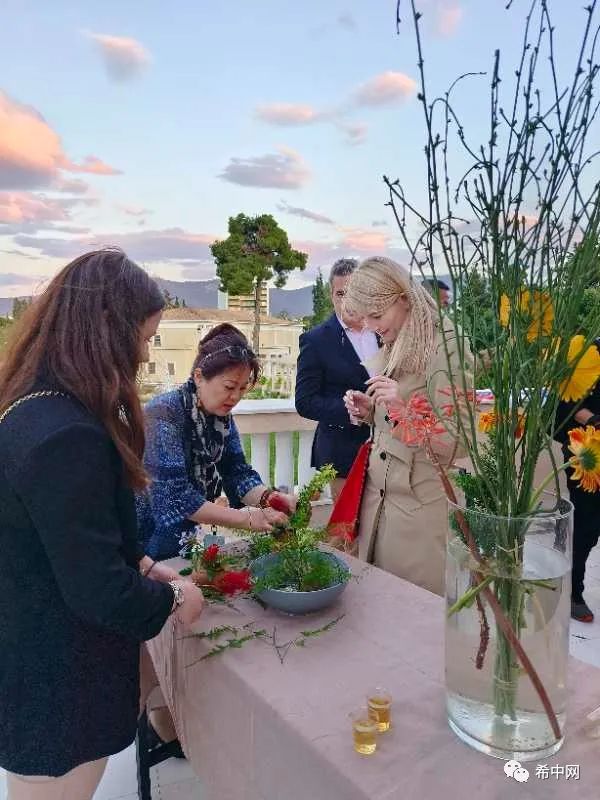 尝试插花的希中商会主席阿弗洛狄特在老师的帮助下完成了她的处女作,她评价到她非常喜欢中式插花,自然且富有内涵,能够体现中国人的性格和价值观。