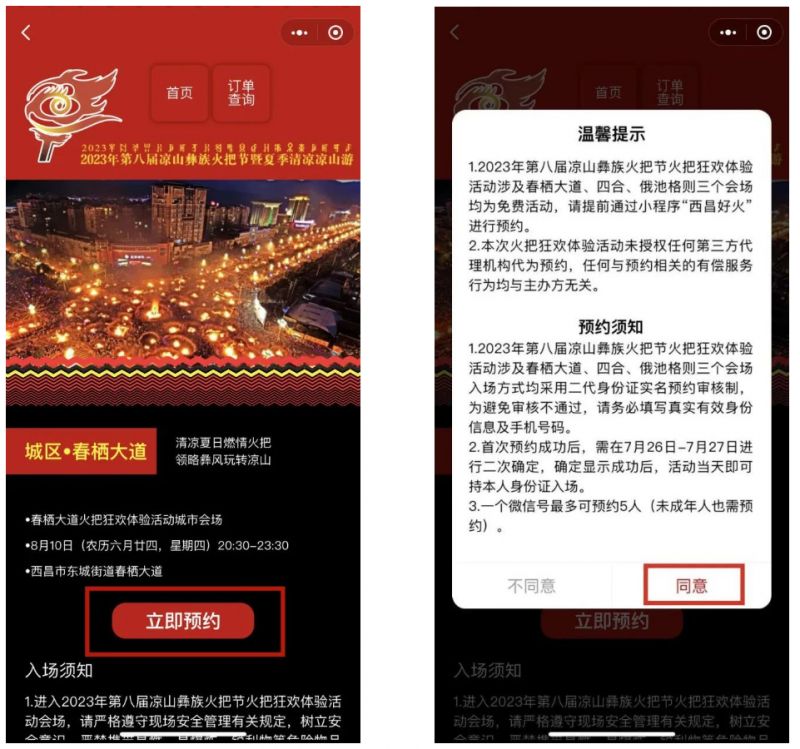 1.2023年第八届凉山彝族火把节火把狂欢体验活动涉及春栖大道、四合、俄池格则、星月湖四个会场入场方式均采用二代身份证实名预约审核制,为避免审核不通过,请务必填写真实有效身份信息及手机号码。