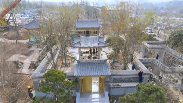 除了水榭与民居,济南展园内的凉亭、廊架、街巷等景观节点已完成主体形态,高大乔木也已经完成栽植。水榭旁,济南市树柳树形态优美,柔软的枝条随风摇曳,让人得以想见开园后“四面荷花三面柳,一城山色半城湖”的济南风韵。